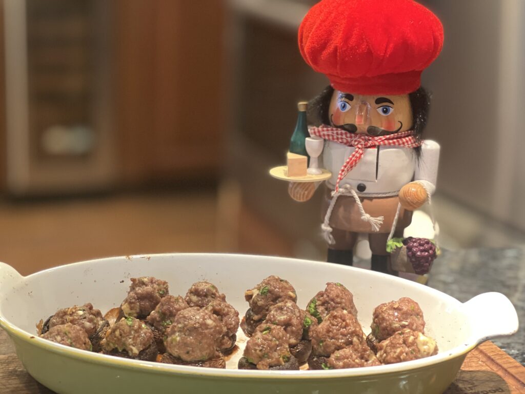 - Combine Beef, Onions, Cheese, Chives, Worcestershire Sauce, Flour, and Seasonings. Form into balls and stuff each of the mushroom caps. Cook for 10-15 minutes (longer if you are using the larger mushrooms.