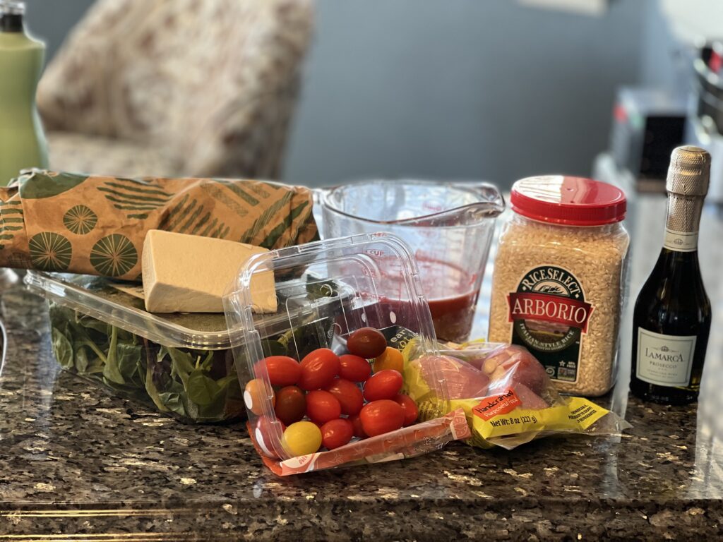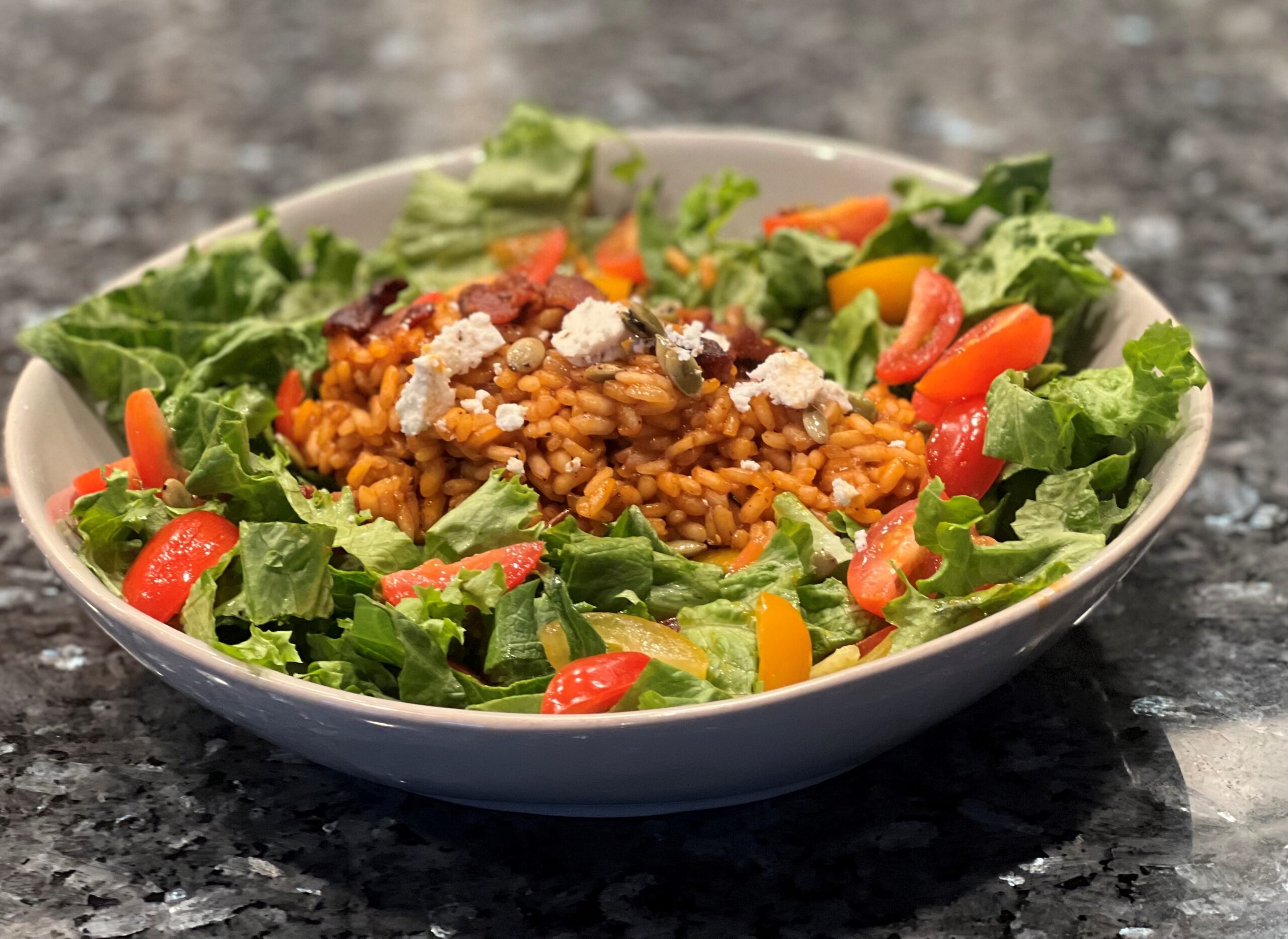 - To serve, separate lettuce among serving bowls. Add a scoop of risotto in the middle. Then top with tomatoes, bacon crumbles, cheese, and pumpkin seeds.