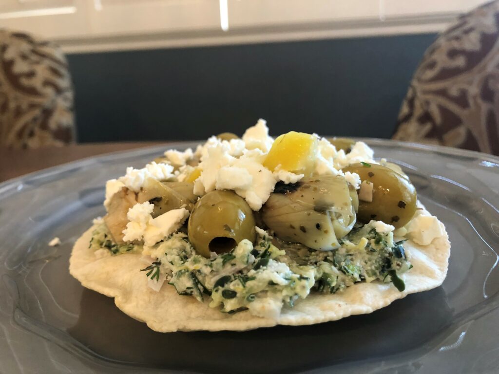 - TO ASSEMBLE: Spread Tzatziki over the “crust” and top with artichoke hearts. Dot with olives, lemon, and cheese for more flavor. Finish with Sumac.