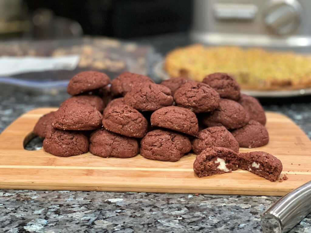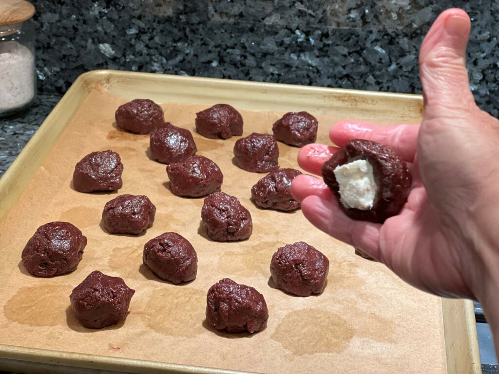 - Scoop dough into balls. Add one frozen CheeseCake square into the center of each dough ball. Roll each ball in powdered sugar and place on baking sheet. Bake for 10-12 minutes or until bottoms start to darken. Cool on a wire rack.
