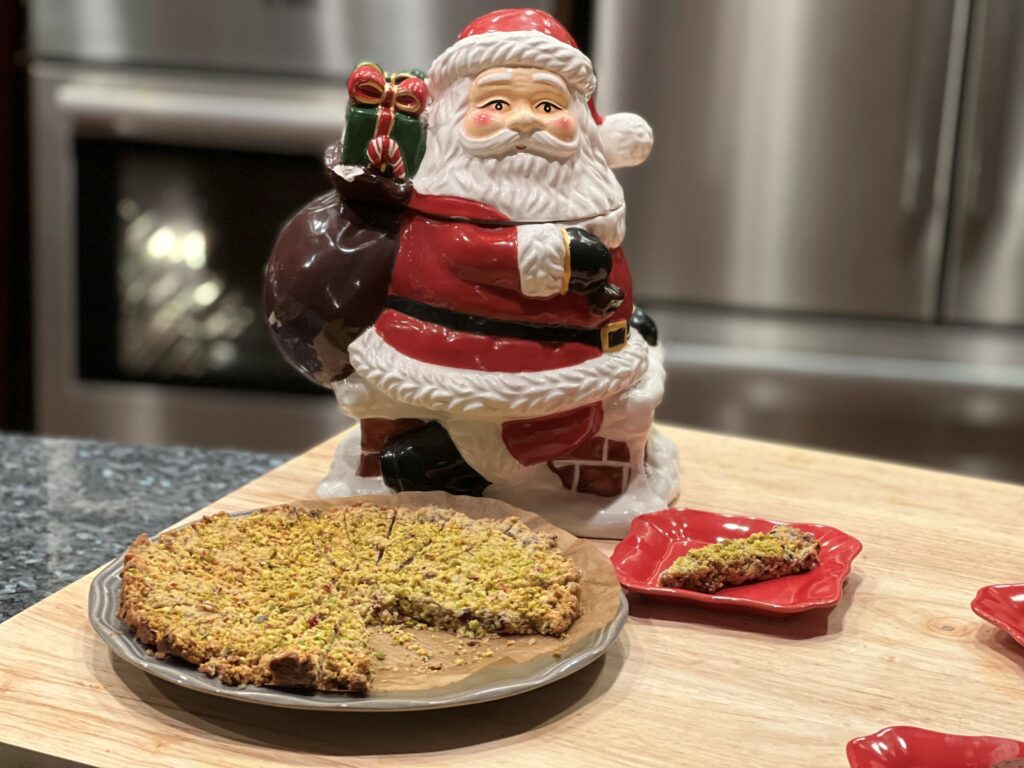 - Move Pistachio mixture to bowl, add flour and salt. Hand Mix and then press into Springform pan. Sprinkle top with remaining pistachios.