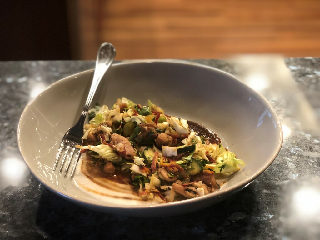 The combination of hot food paired with cold makes this salad really interesting for the senses. We’ve smart-swapped the two dressings for very flavorful versions and eliminated the cheese. But you’ll never miss the cheese because of all the spices and textures this salad offers.