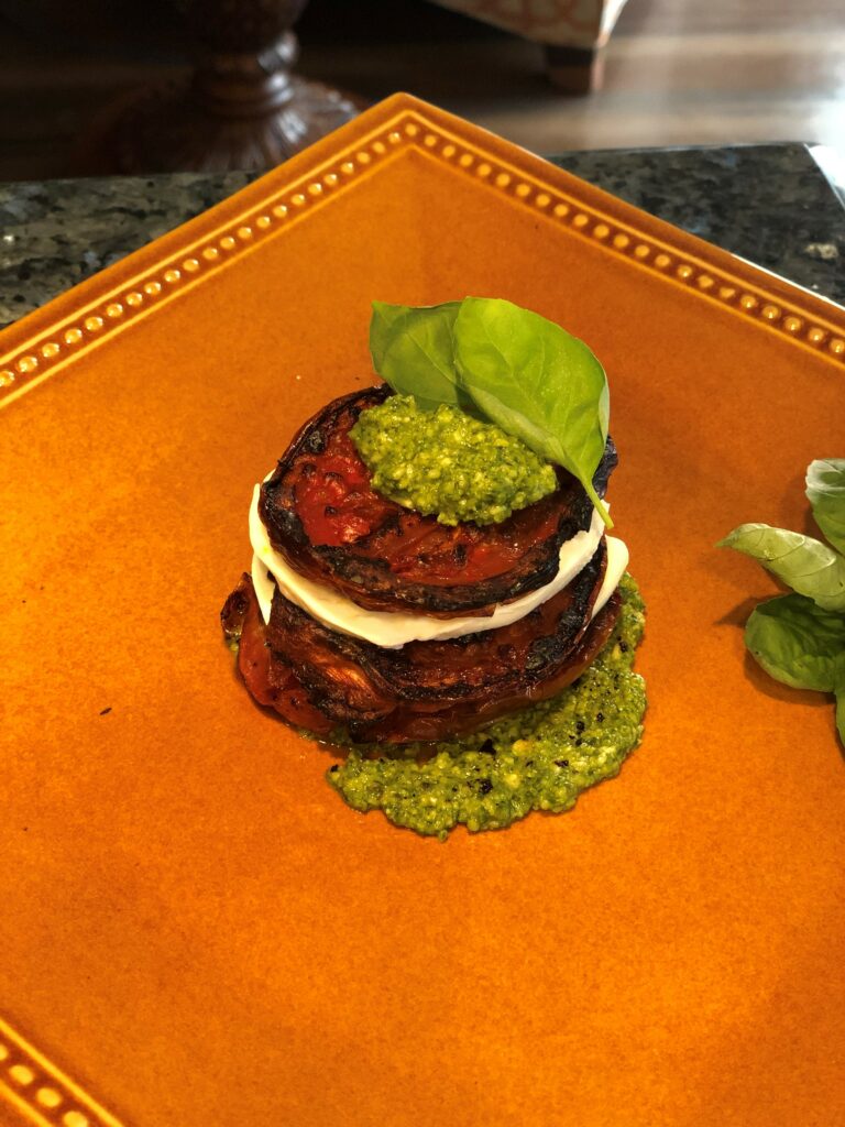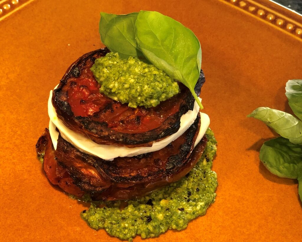 This is like taking a Caprese salad and kicking it up a million notches. The oven-dried tomatoes pair so well with the salty cheese and the rich pesto. And the presentation is Instagram-worthy. The key to managing the calories on this dish is two-fold. One, we cut the calories of the pesto by doubling the volume with raw spinach. The spinach has almost no flavor, so it doesn’t at all take away from the pest. And two, we manage the portion size of the cheese by thin (rather than thick) slicing it. This works in this dish because the flavor of the tomatoes is so concentrated by oven drying them.