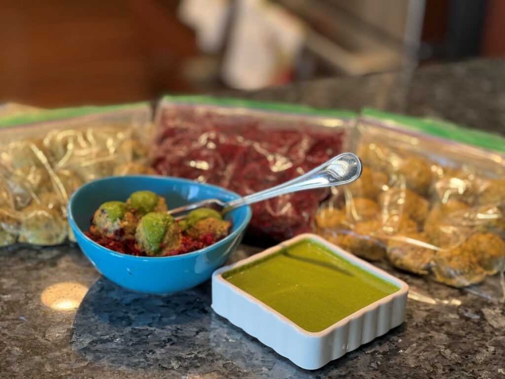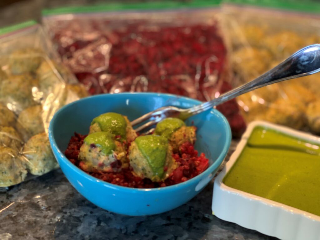 Pesto normally runs 120 calories for 2 tbsps. This one comes in at 45 calories by eliminating the cheese and much of the oil. But you won’t miss either of those ingredients because the flavor is carried by a burst of garlic, lemon juice, and lemon zest, and a super fresh taste.