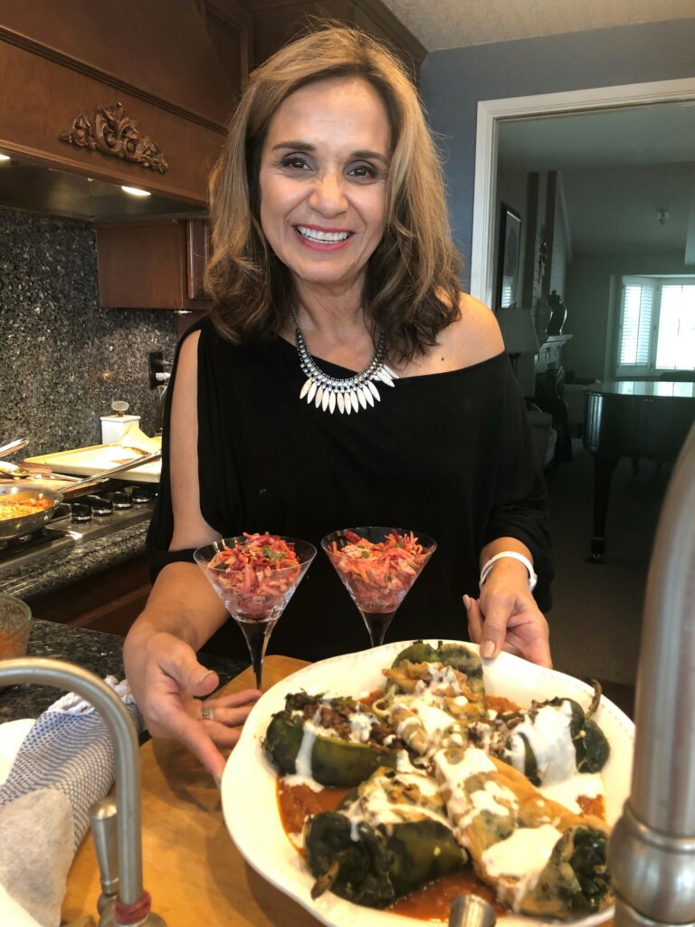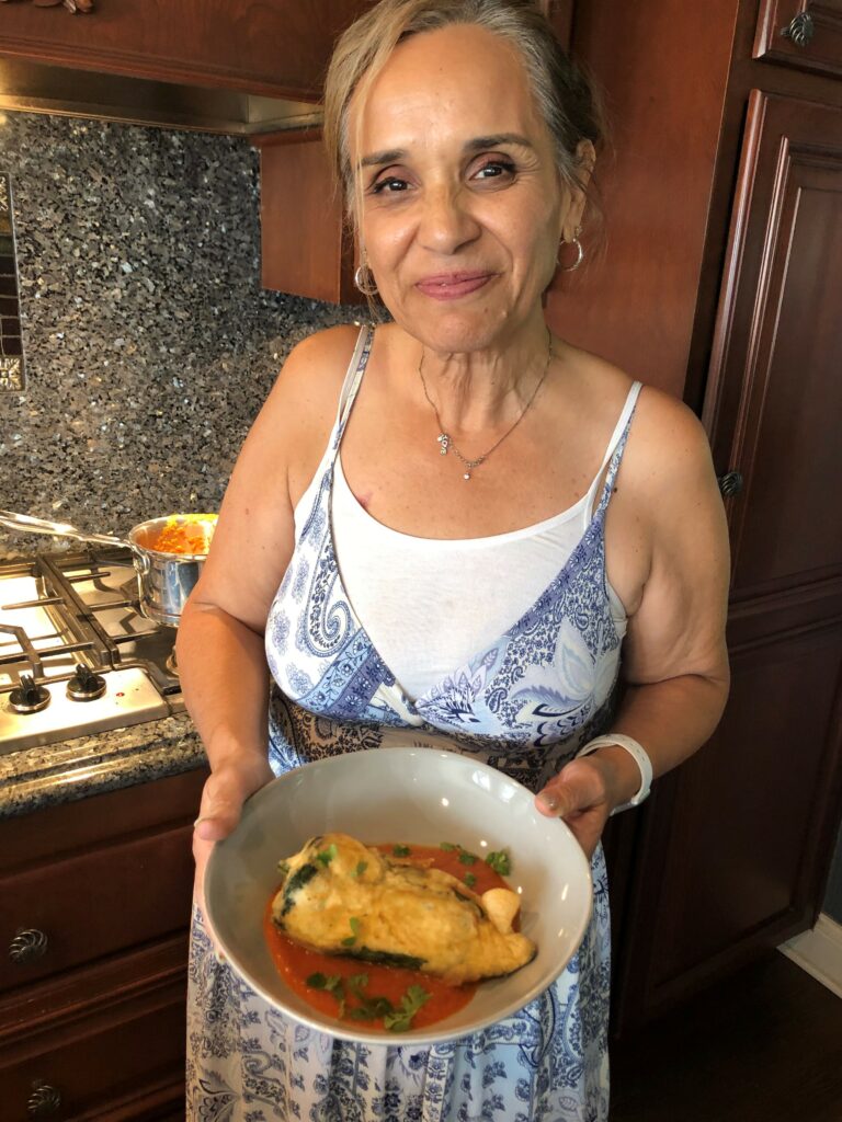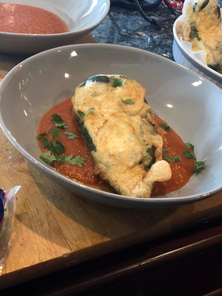 - Warm Sauce in saucepan. Spoon onto plate and serve Chile on top. Finish with Cilantro.