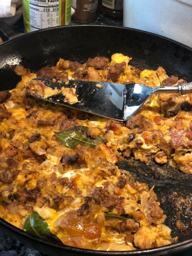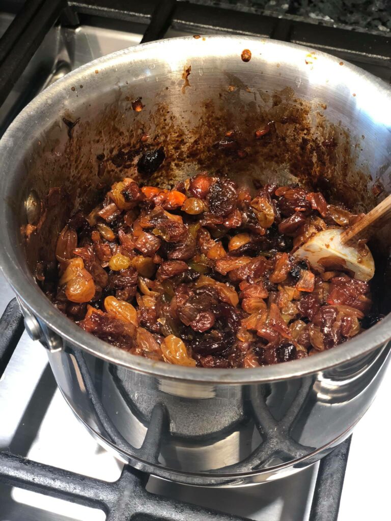 - Heat EVOO in saute pan over medium heat. Add onions and cook until soft. Add garlic and cook until fragrant and the onions started to brown. Add ground meat and stir well, breaking up the large pieces. Add curry paste, spices, chutney, sultanas, and bay leaves. Finish with salt & pepper. Reduce heat to low, cover and simmer for 10 minutes.