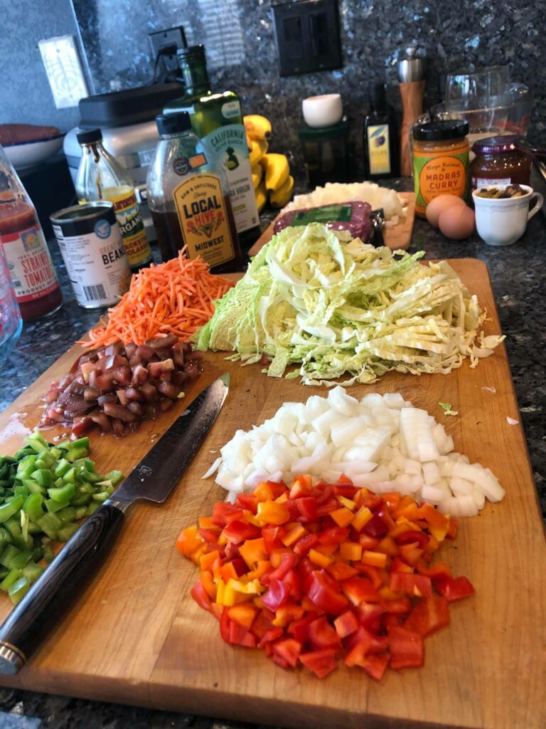 - Add tomatoes, peppers, carrots, and cabbage. Simmer for about 5 minutes. Add Baked Beans and cook for a few minutes longer.