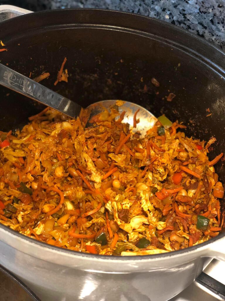 - Heat Oil in a Dutch Oven over Medium heat. Add onion and cook until soft. Add Curry, Garlic, Ginger, Thyme, Smoked Paprika, and Cayenne. Cook until fragrant.