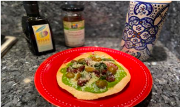 - Place tortilla on a plate and spread pesto then top with tomatoes, artichoke hearts, olives, and cheese (optional). NOTE: Nutritional Yeast is a great alternative to Cheese.