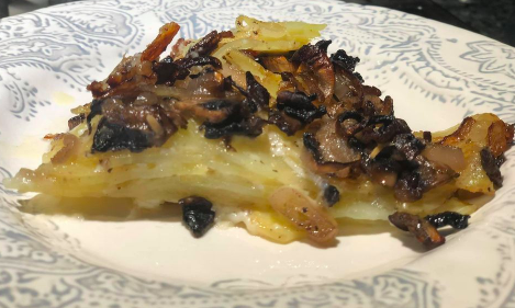 - Add mushrooms and shallots to the top layer of potatoes and move pan to oven (middle rack).