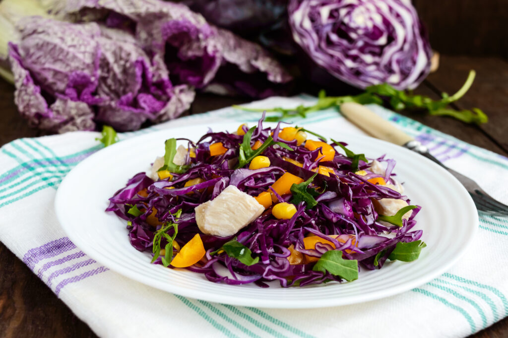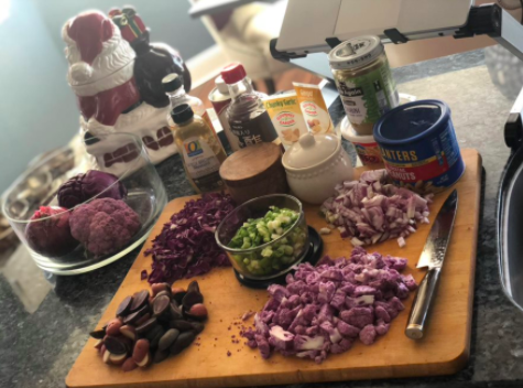 - Purple Potatoes cut in half or quarters (depending upon size) Purple Cabbage, diced