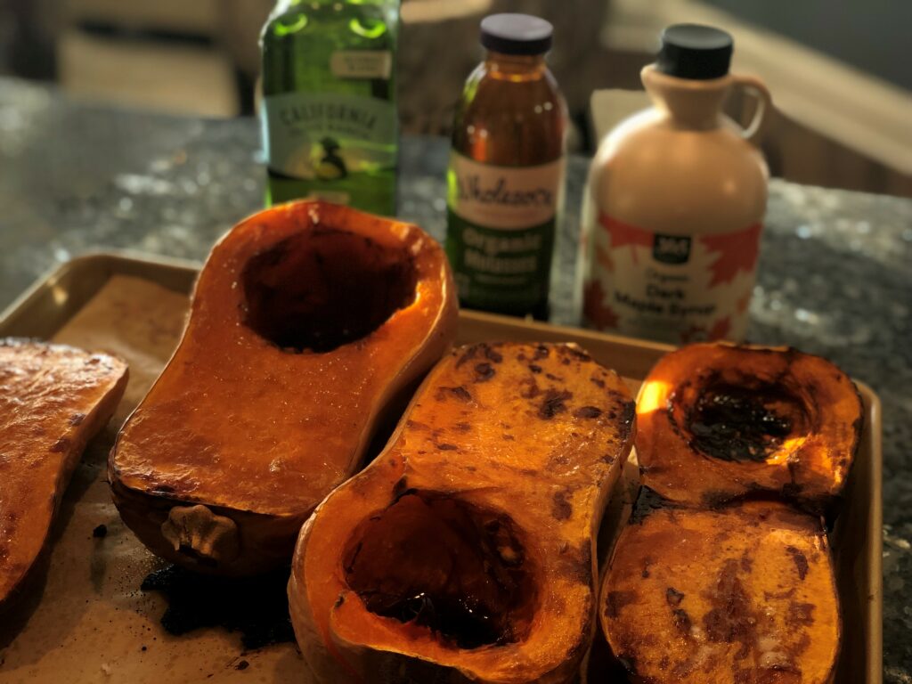 - Mix Molasses, Syrup, and Olive Oil. Brush the cut side of all four halves with the Molasses mixture. Season with Salt & Pepper and place in oven. Roast until soft and caramelized, about 1 hour (depends upon size of squash). Remove from oven and set aside.