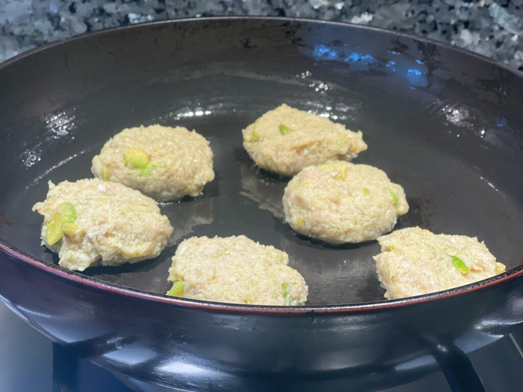 - Heat oil in Saute pan (best if cast iron) over medium. When hot, press pork mixture into the saute pan. Cook first side until crispy. Divide into 8 pieces utilizing a spatula, flip each piece and cook second side. When cooked through, remove from heat.