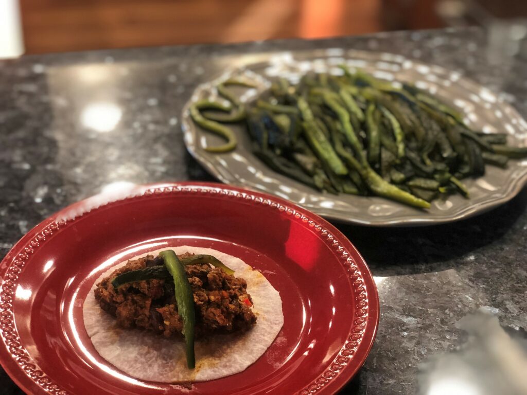 - To serve, place lettuce on plate and scoop a couple tablespoons of meat into each. Top with roasted poblanos.