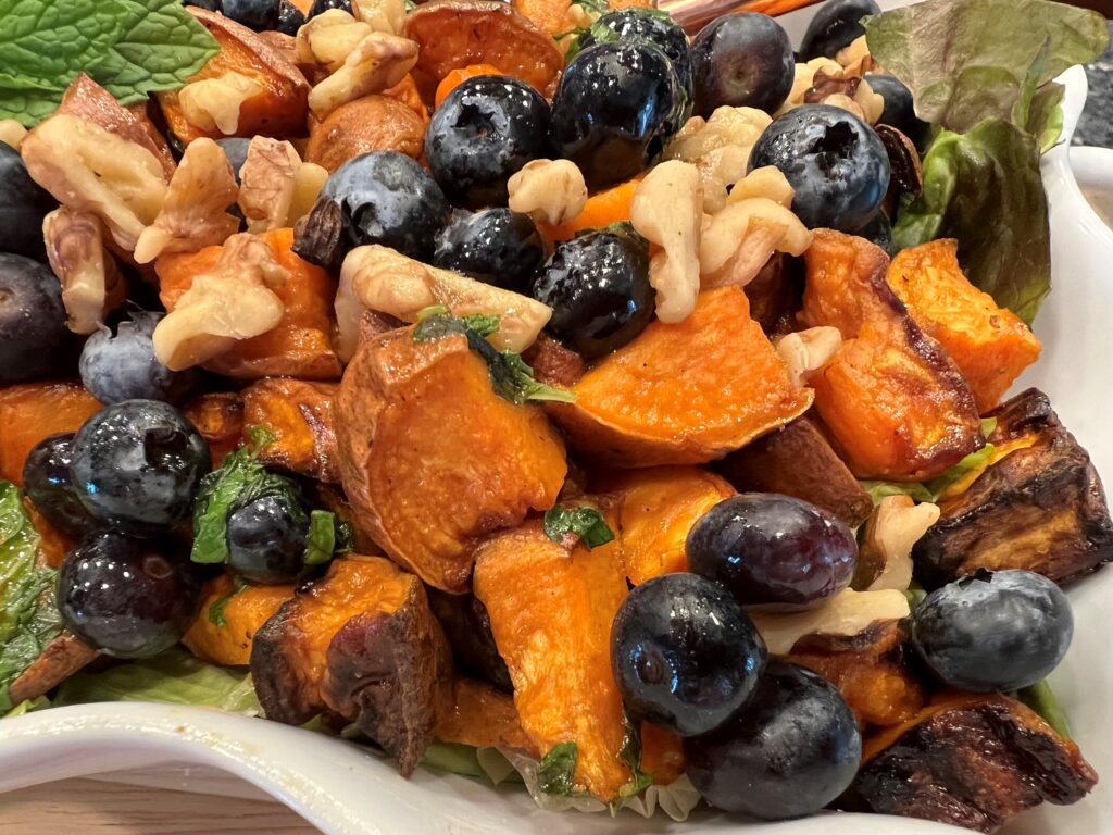 - When Sweet Potatoes are done, remove from oven, and immediately toss with Honey Lime dressing. Combine blueberries, then set aside.