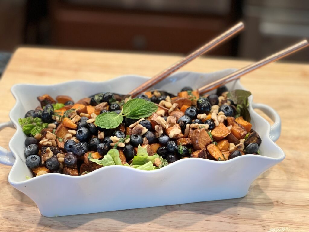 This salad is an amazing combination creamy sweet potatoes, sweet blueberries, and a bright dressing of lime juice, honey, and fresh mint. We dress the potatoes as soon as they come out of the oven and are still hot. This helps them absorb so much more flavor and moisture. So no mayo, sour cream, or yoghurt is needed, keeping the excess calories extra light. And the punch of flavor from the mint infused Honey-Lime dressing is in a word...incredible.