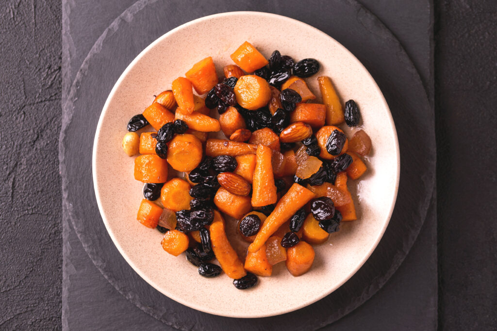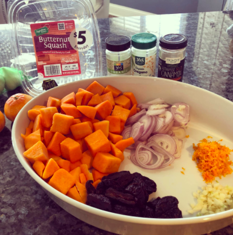 - Place Squash, Prunes, Garlic, Shallots, and Spices in baking dish and mix well and spread out.